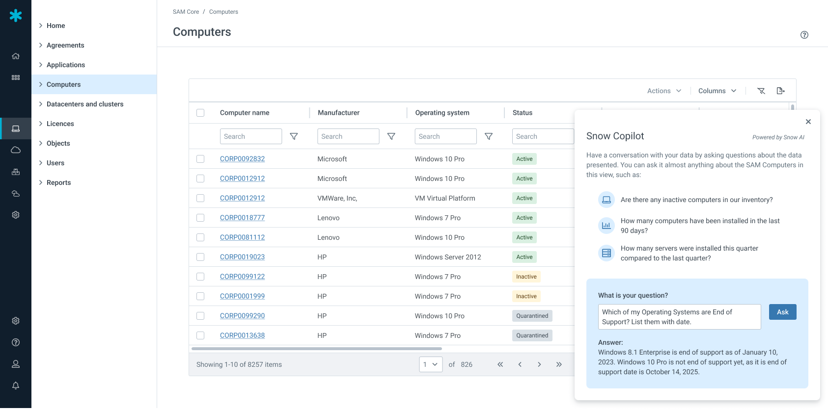Snow Copilot, one of the first AI assistants developed to solve advanced challenges for ITAM and FinOps, leverages the Microsoft Azure OpenAI Service. It allows customers to input questions and receive insights on their computer data, such as “How many computers have been installed in the last 90 days?,” as well as explore “what if” scenarios all directly within Snow Atlas. Snow Copilot reduces the need to export data into PowerBI or Excel to get insights into advanced questions on forecasting, asset allocation, and trend identification of SAM computer data. All data remains secure in the customer environment ensuring data privacy and integrity.