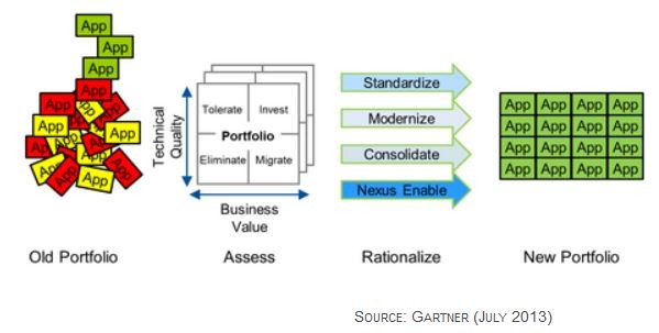 Gartner says “Application rationalization is the radical reshuffling of an application portfolio as part of an application strategy, a plan that implements changes to applications to achieve a business outcome.” They also list one of the key requirements of application rationalization, is to “Prepare the legacy application portfolio for fast-emerging business requirements brought on by market changes such as cloud, big data, social and mobile.”