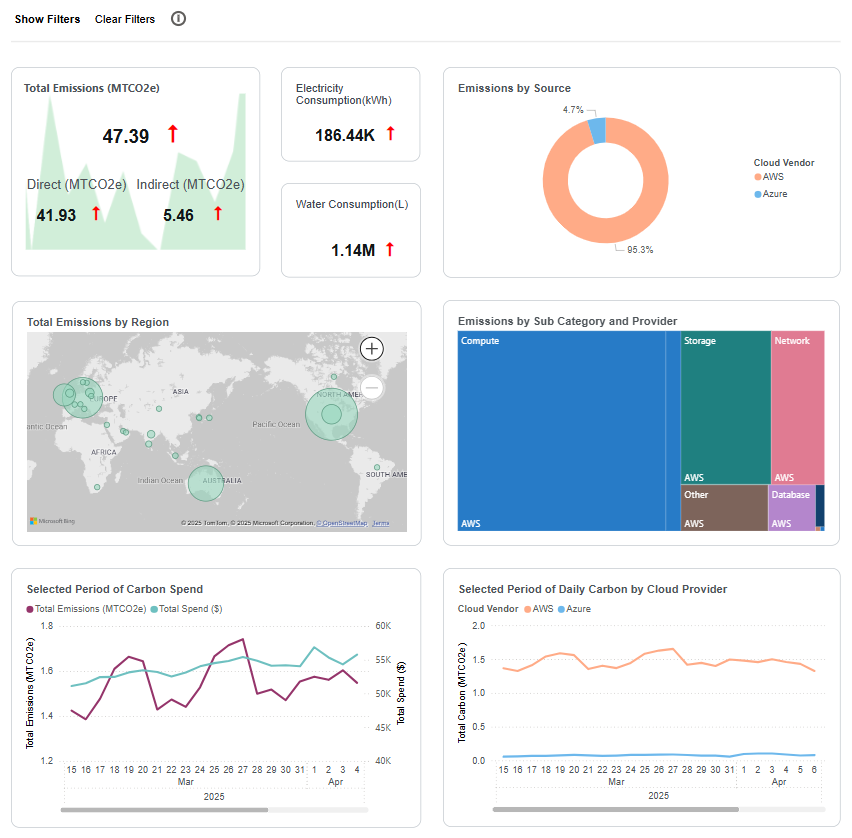 - Carbon footprint visibility. Gain comprehensive analysis of environmental impact across Amazon Web Services, Microsoft Azure and soon Google Cloud infrastructure through Cloud Cost Optimization integration. This unified dashboard provides resource-level visibility into key cloud sustainability metrics including carbon emissions, water consumption and electricity usage—all through standardized measurement methodologies