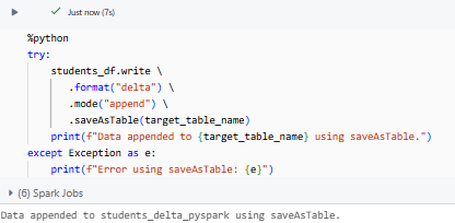 As discussed in a previous section, the DataFrameWriter API in Databricks PySpark and Scala allows you to write the contents of a DataFrame to a table using methods like .saveAsTable(“table_name”) or .insertInto(“table_name”) with various modes (append, overwrite).