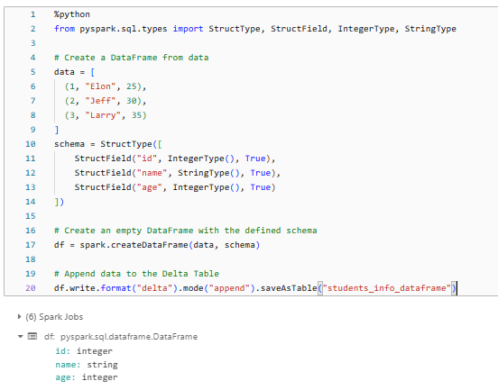 As you can see, this SQL statement creates a new Delta Table named students_info with three columns: id (integer), name (string) and age (integer). The USING DELTA clause specifies that the table should be created as a Delta Table and the LOCATION clause defines the path where the Delta Table files will be stored.