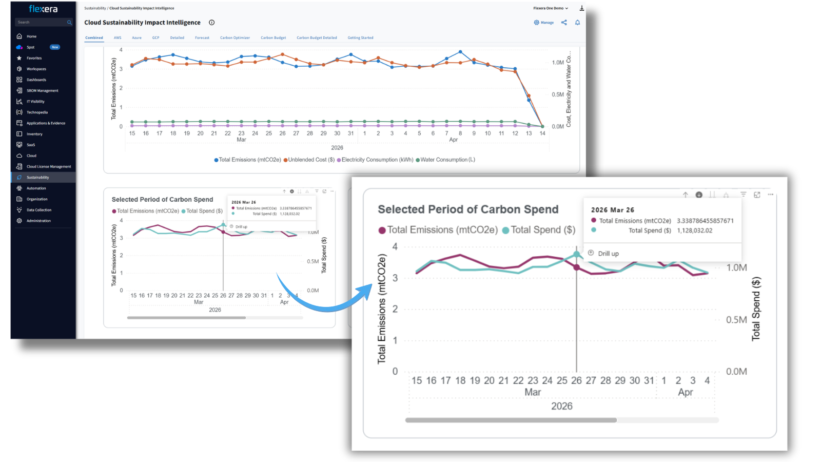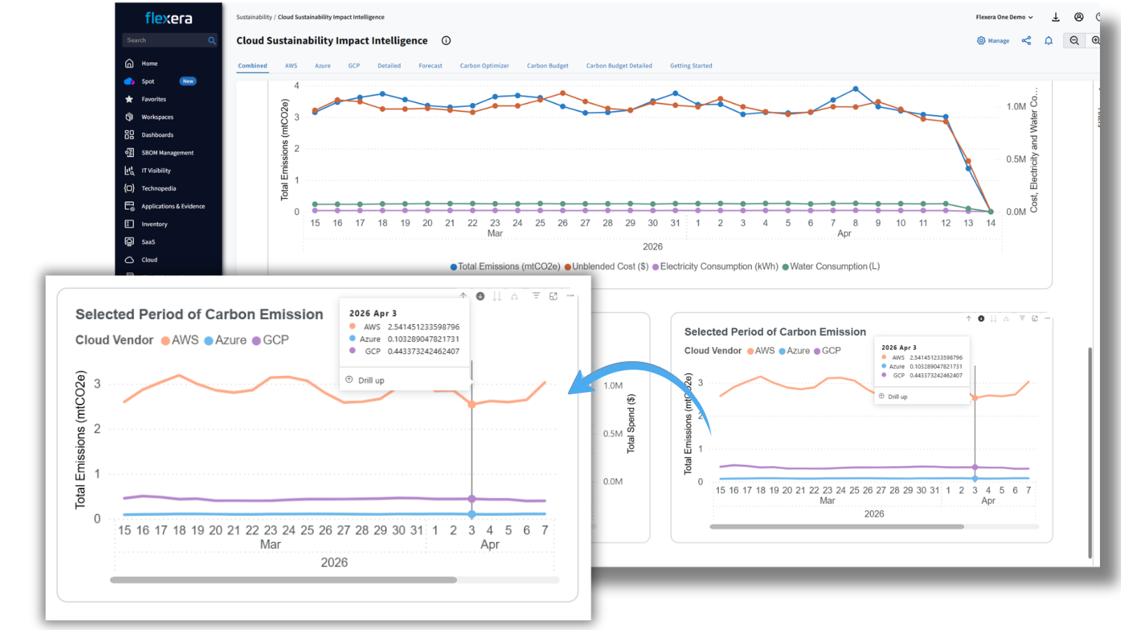 - Connect your cloud billing data to sustainability metrics. Flexera One Cloud Sustainability uses your existing cloud billing data combined with auditable emissions factors from Flexera partner Greenpixie to generate carbon (CO₂e), energy, and water metrics. This isn’t a separate data pipeline; it’s a sustainability layer built on top of the financial data you already trust.