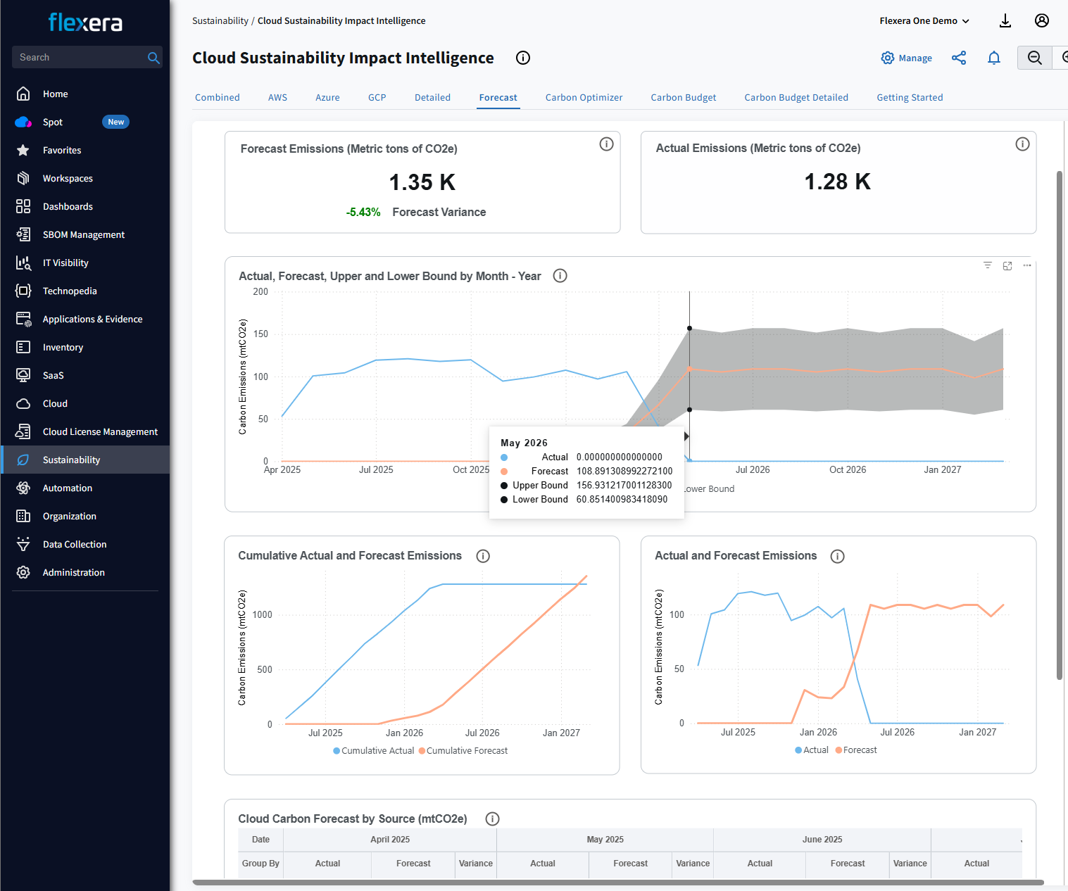 - Introduce forecasting. Backward-looking reports tell you where you’ve been. Forecasting tells you where you’re heading and whether you’ll hit your targets at the current trajectory. Flexera’s carbon forecasting uses auditable, confidence-banded trend visuals built from historical emissions data. This gives FinOps and sustainability leaders forward-looking signals, not just rearview reporting, and creates early warning when you’re drifting off track.