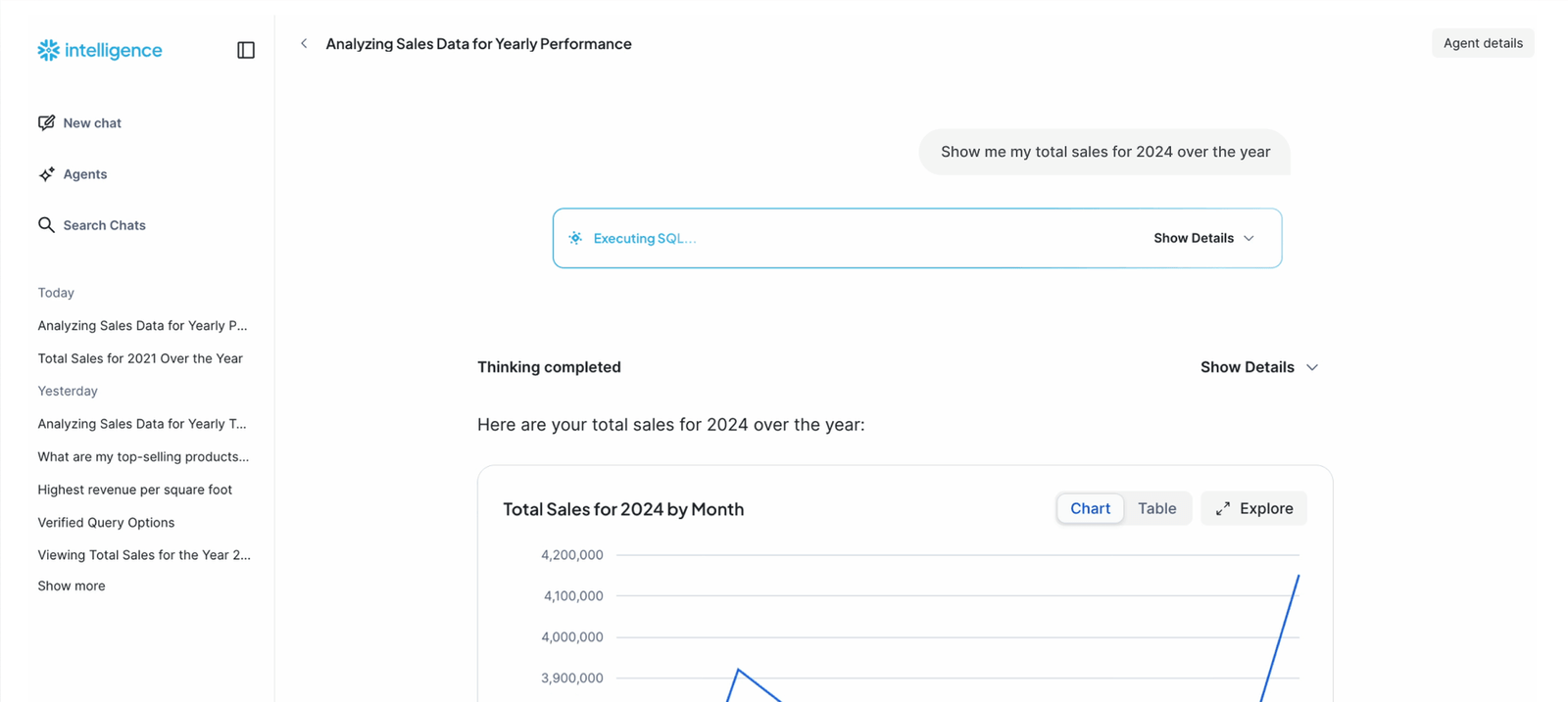 The long-anticipated Snowflake Intelligence is now generally available. You can ask questions in simple plain English (or natural-language commands), and Snowflake will answer with SQL and charts. It uses LLM-powered agents under the hood to parse queries and fetch results.
