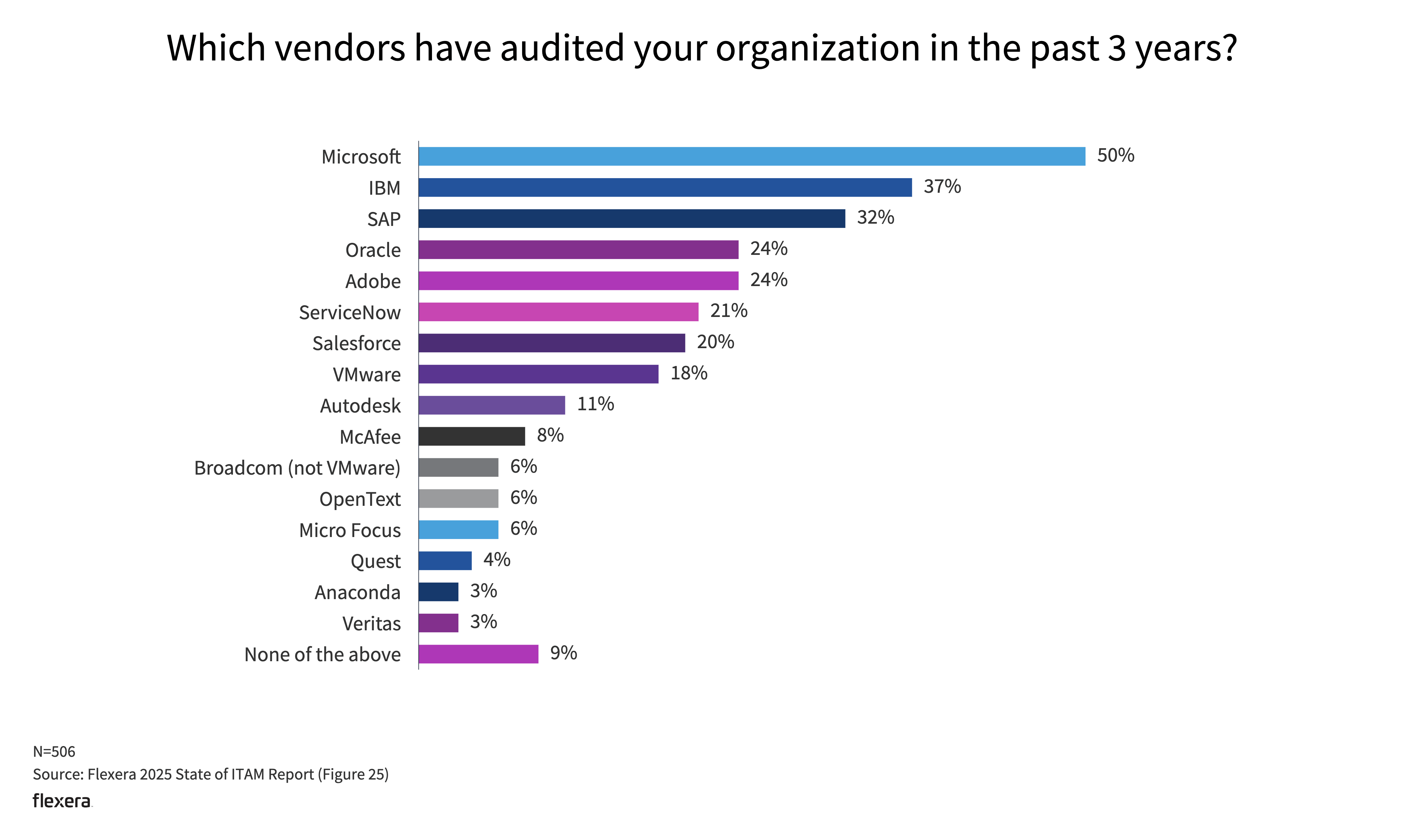 Vendor audits are pervasive and expensive. According to the Flexera 2025 State of ITAM Report, 45% of organizations paid more than $1 million in audit expenses over the last three years. The chart below highlights the top vendors who’ve been auditing, and when compared to previous reports, the order hasn’t changed much.