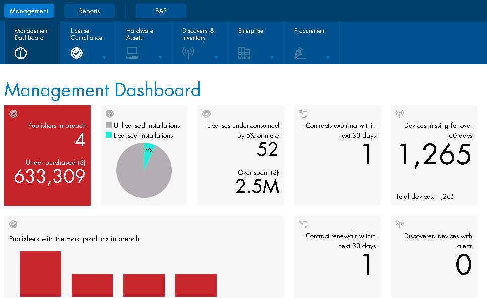 A new release of FlexNet Manager Suite Cloud, Flexera’s Software as a Service (SaaS) offering for software license compliance and license optimization went live on February 1st. This release delivers amazing new features, from being able to manage hardware assets, contracts, purchase orders, and vendors to running license simulations (What If Analysis) and building ad-hoc reports. FlexNet Manager for SAP Applications has also been added to our SaaS delivery model. The new release is built around ‘management by exceptions’, where automated business processes handle most of the software asset management workload, and cases that deviate from the normal or expected behavior are identified and brought to the operator’s attention. These items are found in the dashboard widgets and can be accessed by drilling through or by selecting dedicated features from the menu. In most screens, all known issues are reported and described to the operator.