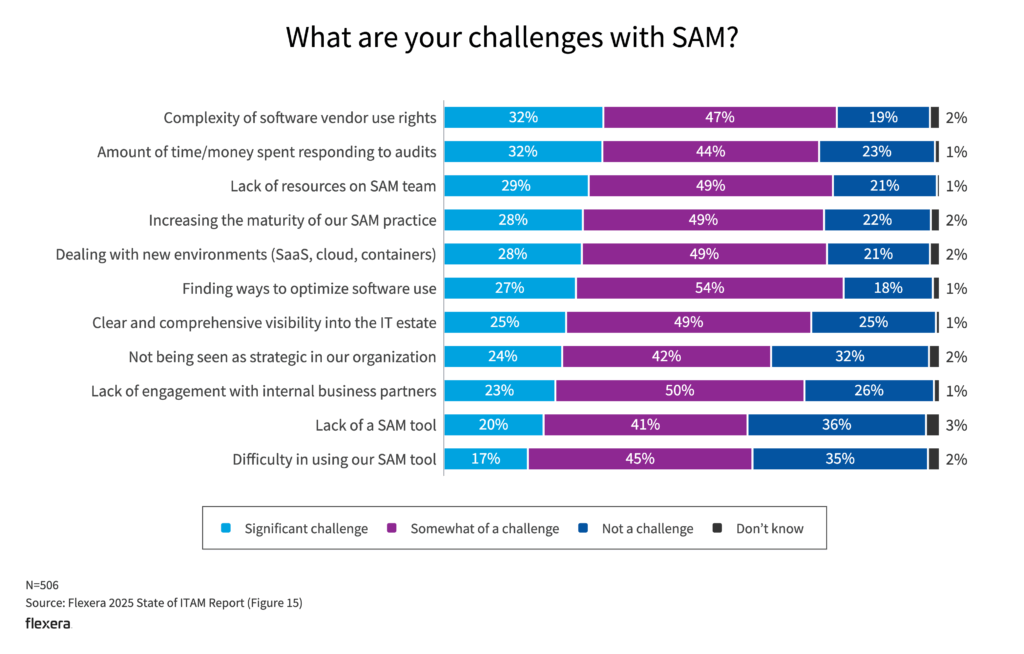 With the formation of FinOps and its convergence with ITAM, effective software license management is an increasingly critical required capability for organizations of all sizes. It impacts compliance, cost control and overall IT governance. But the complexity of software licensing agreements and the evolving nature of software distribution models make it challenging to maintain compliance while optimizing costs. According to Flexera’s 2025 State of ITAM Report, the complexity of vendor product use rights was the #1 challenge.