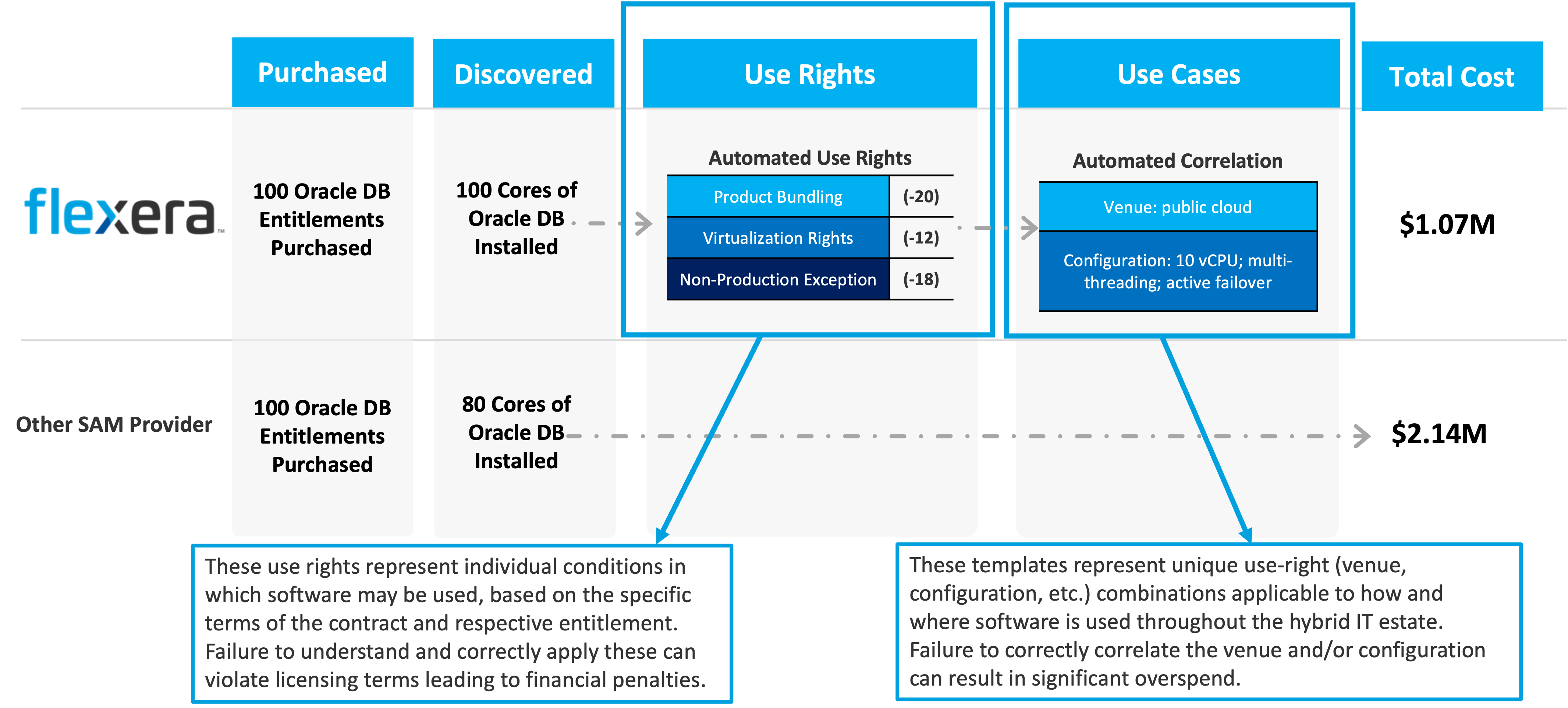 PUR and product use right templates are indispensable elements of software license management required to optimize software licensing, without utilizing PUR and product use rights you are paying more money to increase your compliance risk. Flexera is the only software asset management (SAM) tool that optimizes the application of product use rights and use case templates supporting advanced hybrid software license management, making us the market leader in SAM.