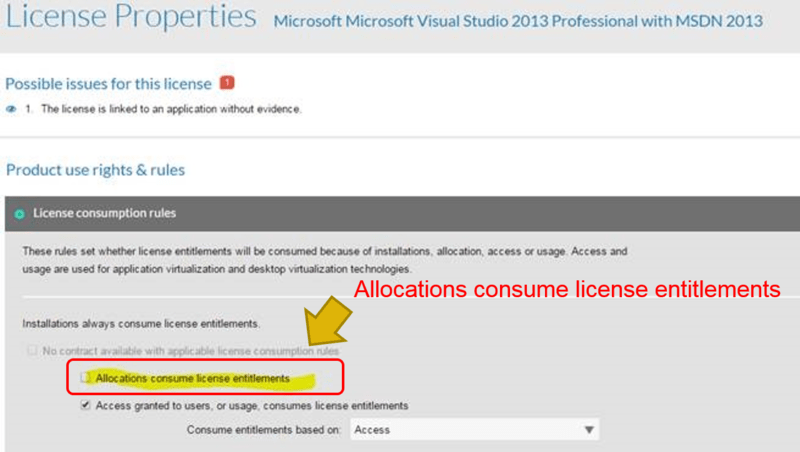 In the software asset management and license optimization tool, this can be accommodated by “checking the box” for allocation equating to license consumption, as shown in this screenshot: