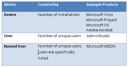 Client or User based licenses are the most prevalent metrics in the industry and are commonly used for lower cost applications (i.e. less than $1000). Under these types of models, licenses are counted based on the number of devices where the software is installed or the number of users who access the software. Variations of this model include: