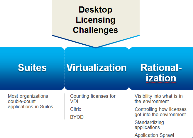 Virtualized desktops add significant complexity to desktop license management. Before the advent of VDI, organizations could rely on their desktop inventory tools (such as Microsoft SCCM) to give a fairly accurate count of applications. Now, there may not be any installations on the endpoint device if they are being accessed via a virtual desktop or virtual application. In this case, companies must use multiple sources of data (e.g. SCCM and Citrix) and apply complex use rights to accurately count historically simple licenses (such as Visio, Office, etc.). Software License Optimization tools need to provide this capability to enable organizations to accurately manage licenses in these environments.