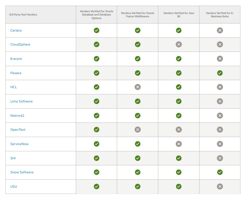 Oracle’s GLAS verification for third-party tool vendors is used to ensure that the SAM tools reviewed provide accurate Oracle usage data. Customers can have the confidence that any tool reviewed is accurately collecting software deployment information of the Oracle product(s) listed.