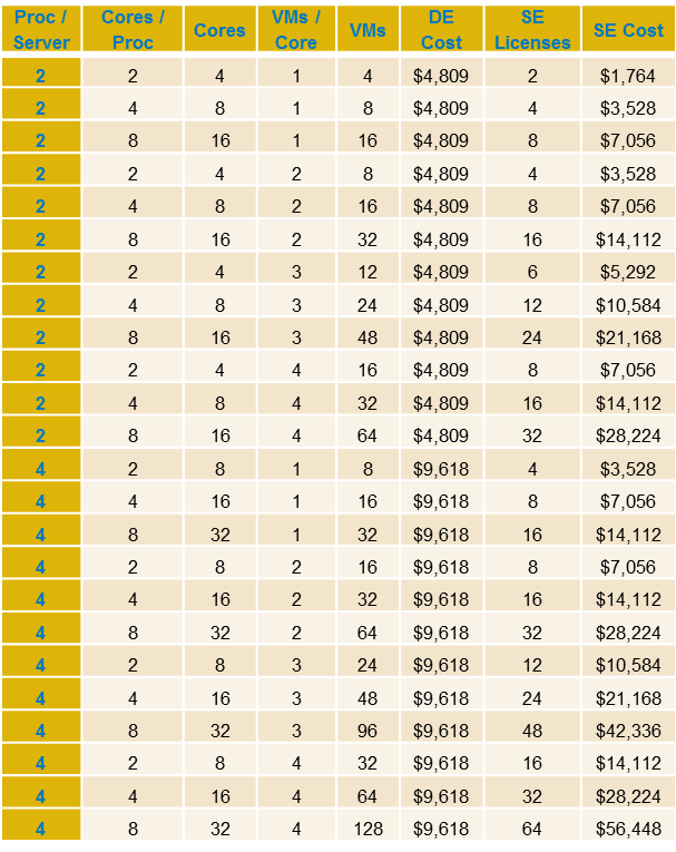 On the other hand, if you are optimizing your hardware with stacked Standard edition licenses in mind, would you come to a different conclusion? If you have more processors per server and a lower core count per processor, how does that change the outcome? Example: A server with 4 dual core processors—8 cores. It would take 2 Datacenter edition licenses to cover the 4 processors at a cost of $4809 x 2=$9,618. The number of VMs, using our 1-4 mapping is 8-32 VMs. The cost of Standard edition licenses to cover 4 processors is $882 x 2 = $1764, where each license covers 2 processors, but only 4 VMs can be running. If you need 8 or 16 VMs then stacking Standard Edition (SE) licenses costs less than Datacenter Edition (DE) as per Table 1. At 24 VMs, DE is less expensive.