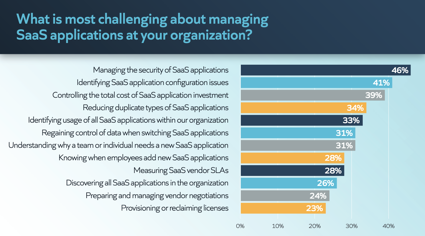 It’s not a surprise that controlling costs and reducing duplicate types of SaaS applications top the list of SaaS management challenges.