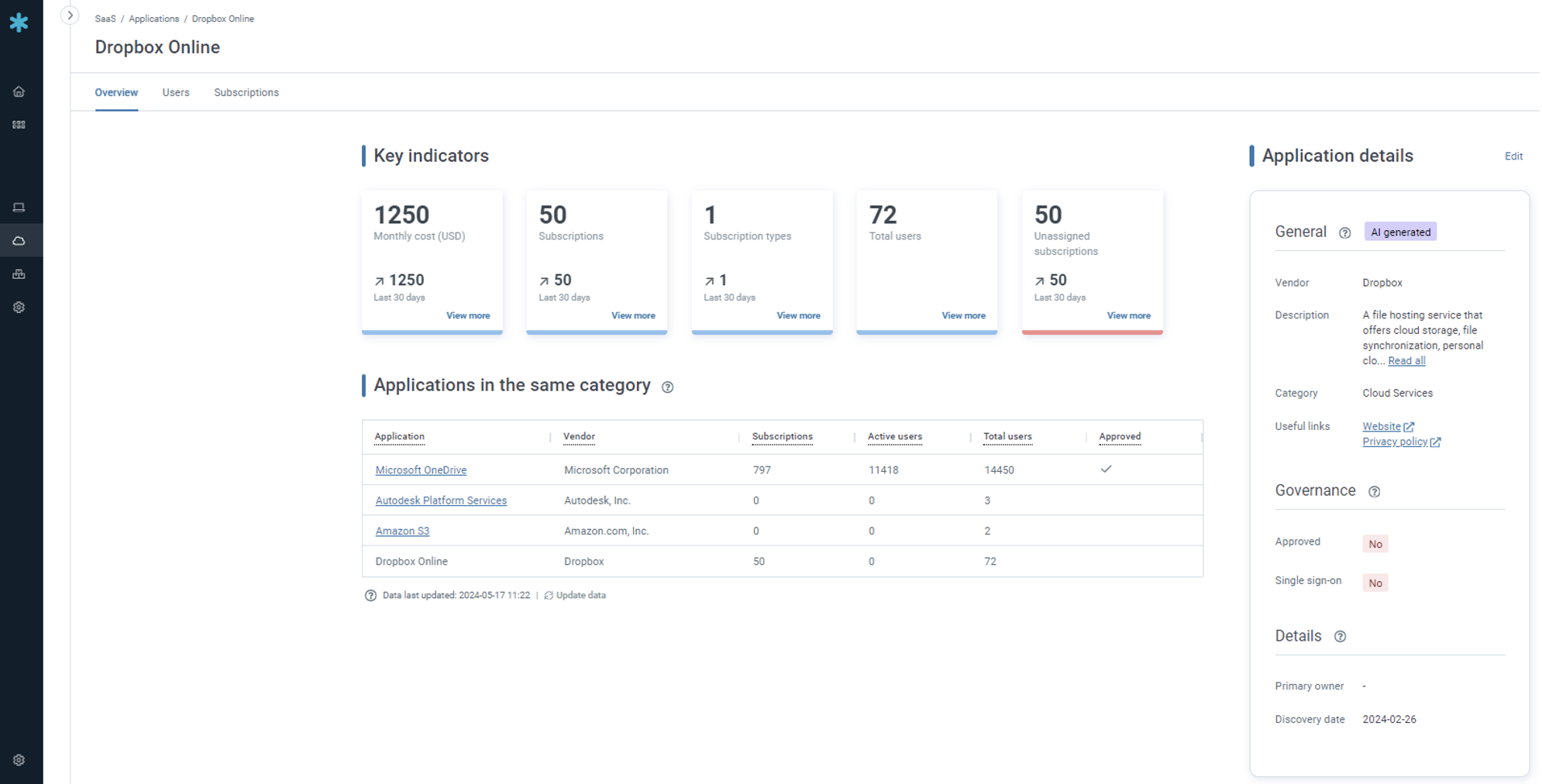 And if you’re short on time, here’s a quick example below: we see we have standardized on Microsoft OneDrive, but also have a subscription to Dropbox Online with no active users. The good news is we can likely drop this subscription because no one is using it. The bad news is we may have over-allocated our licenses and might have to pay penalties. This is data we can immediately act on to reduce costs.
