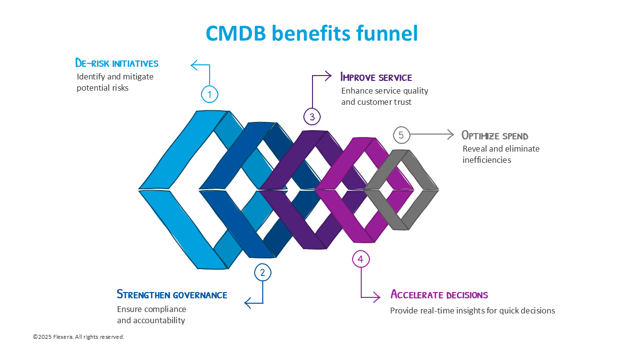 Far from being a tool solely for IT operations, a CMDB provides a comprehensive, dynamic map of an organization’s digital assets and their interdependencies. This visibility empowers executives to align technology with business goals and drive smarter investments. The benefits of a CMDB are wide-ranging, including risk mitigation, cost optimization, enhanced decision-making, smart governance and improved service delivery.