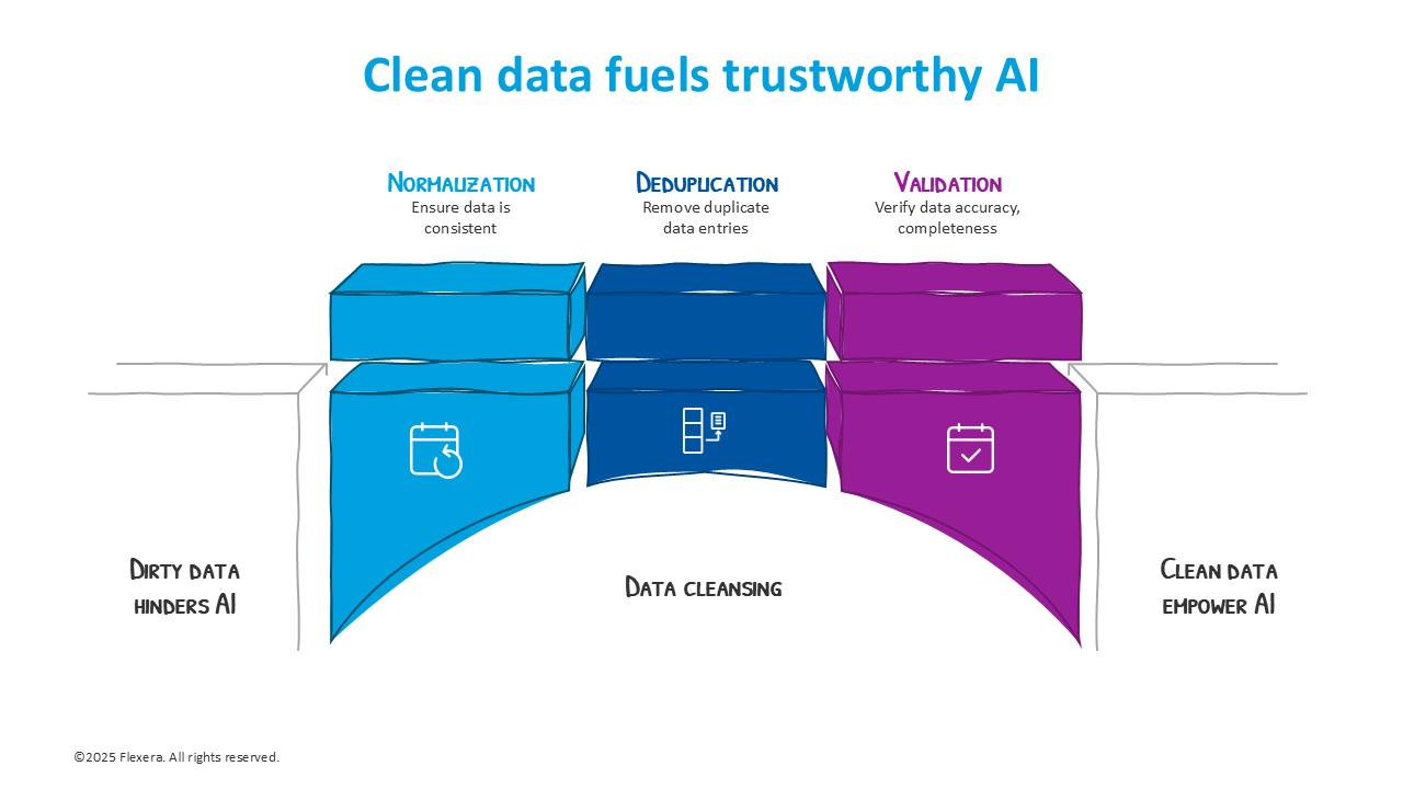 In a CMDB, if asset relationships are outdated or misclassified, AI might misinterpret dependencies, leading to incorrect risk assessments or impact analyses. Data cleansing, such as normalization, deduplication and validation are essential steps in preparing data for AI training and inference.