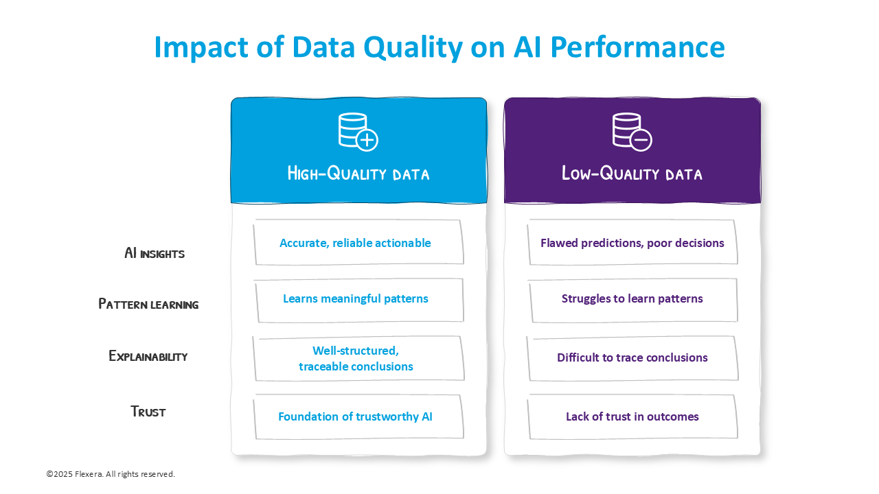 High-quality data allows AI to deliver reliable insights efficiently, and it enhances explainability. When data is well-structured and traceable, it’s easier to understand how AI arrived at a particular conclusion, which is critical for compliance, governance, and executive confidence.