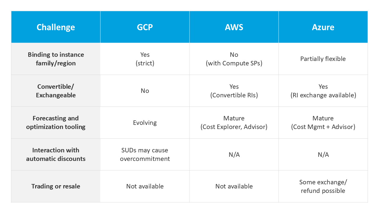 Unlike AWS Convertible Reserved Instances or Azure Reserved Instance Exchanges, GCP offers no official way to modify or cancel commitments mid-term. This lack of flexibility can result in sunk costs, especially for organizations in dynamic environments that frequently change workloads or machine types. - Forecasting and optimization tooling