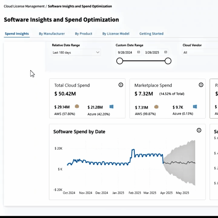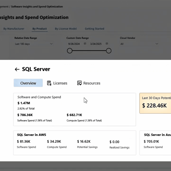 Before you can make optimization decisions on your cloud software you first need an overview of what software you have, and where it’s located. With Flexera Cloud License Management, you gain clear visibility into your software spend across multiple cloud platforms dive deep into your spend by product or license model.