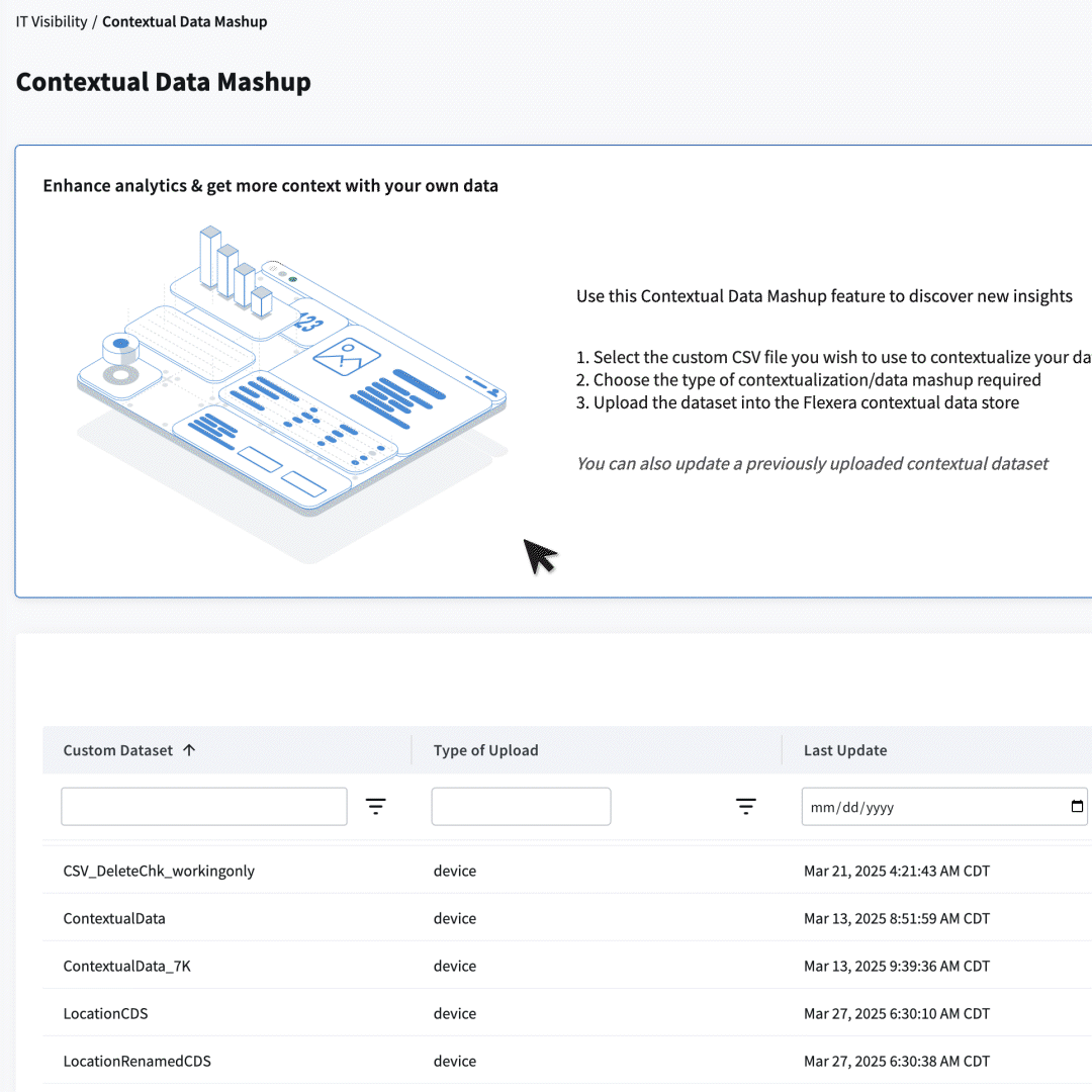 - Easy CSV upload: Quickly upload your business context against devices or software inventory via CSV files. Contextual Data Mashup automatically detects reference/key and attribute columns and assigns data types to your contextual information, reducing manual intervention and errors.