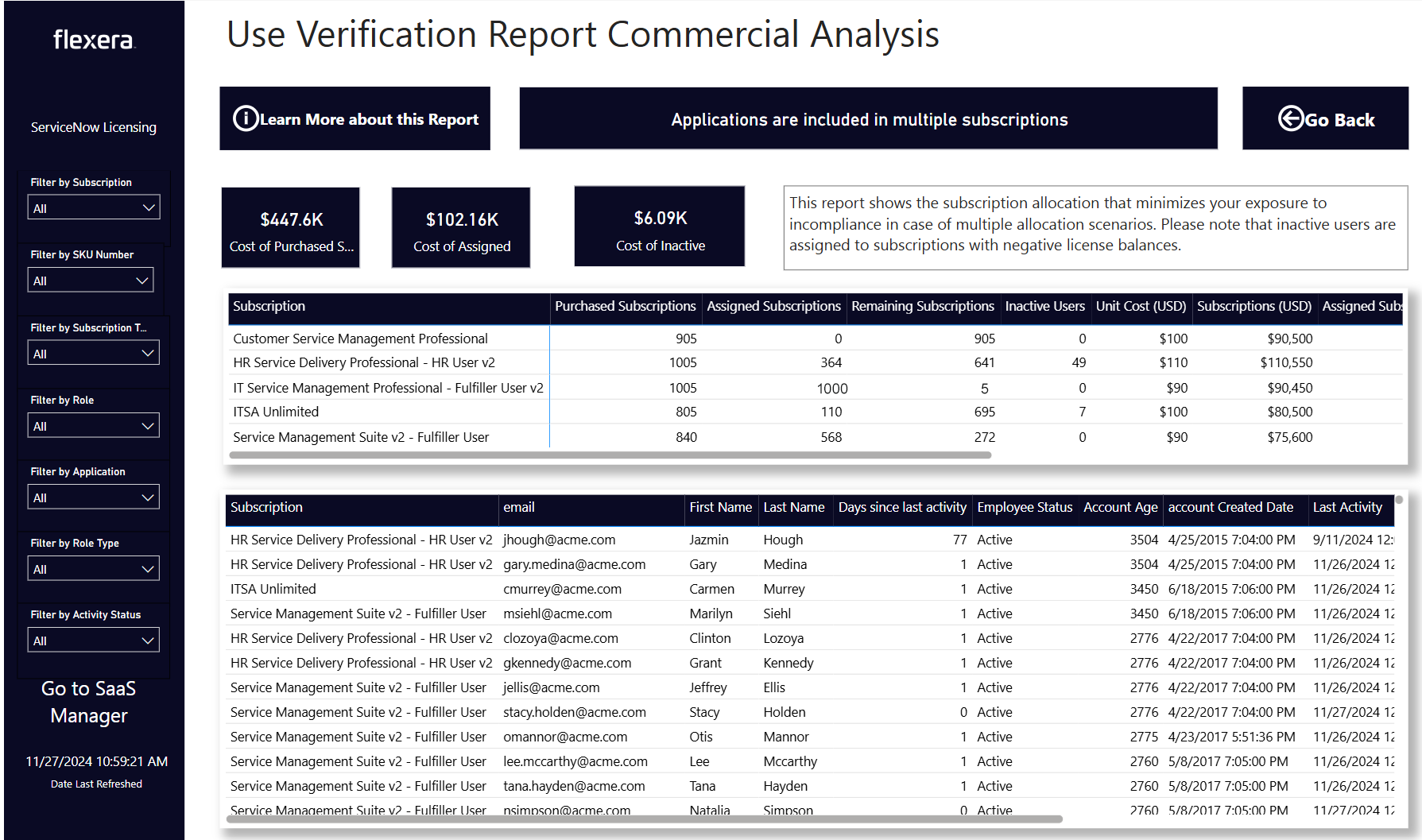 In this example below, the ServiceNow application Request Management is included in three subscriptions—Fulfiller User v2, Customer Service Management Professional and ITSA Unlimited. The use verification report commercial analysis helps administrators decide the best way to allocate licenses to ensure license compliance. While this example shows that while the Fulfiller license is the most cost-effective option, ultimately the ITSA Unlimited subscription is better maintains compliance.