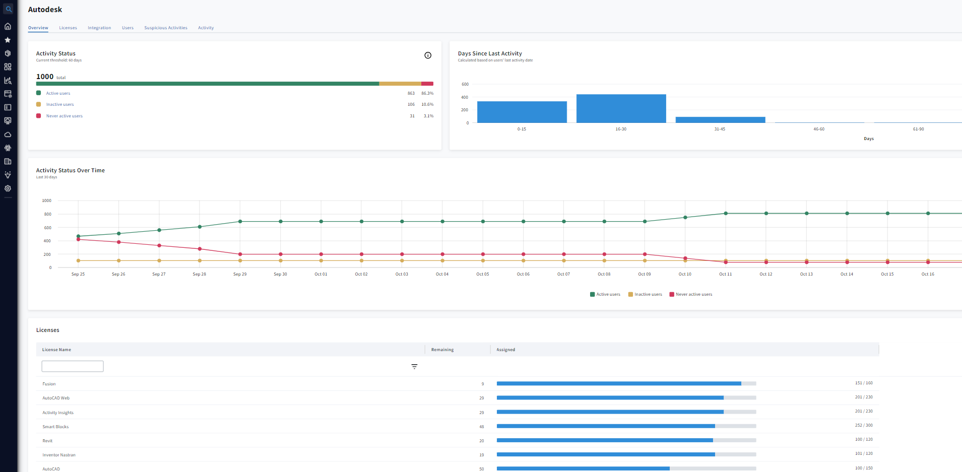 - Identify suspicious activities such as an active Autodesk user that is not active in your HR roster.