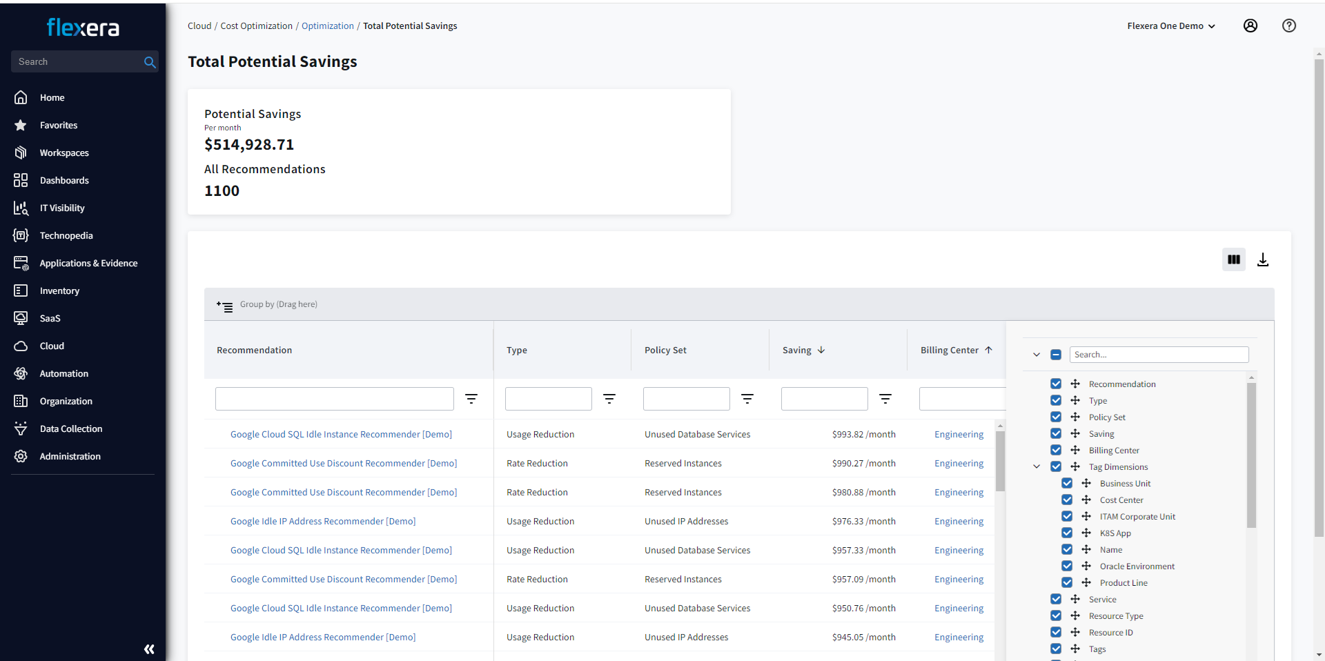 Flexera has long supported Tag Dimensions, enabling you to create custom dimensions for more granular cloud spend tracking. These Tag Dimensions can now be used to filter and group recommendations in the Rate and Usage Reduction tables, providing further, in-depth insights into cloud spend and allocation.