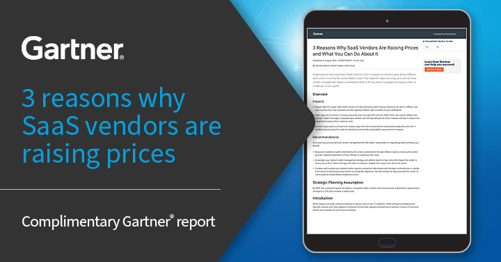 1Gartner, Thought Leadership, “Predicts 2022: 3 Reasons Why SaaS Vendors Are Raising Prices and What You Can Do About It” by analysts: Hannah Decker, Quintin Casper, Melanie Alexander, Dawn Hubbard, Gunjan Gupta, Stephen White, 26 August 2022.