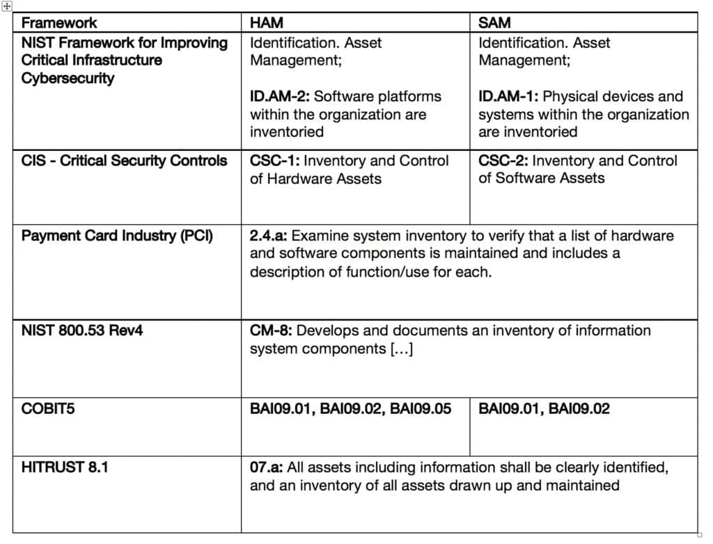 And looking back, all I did was to highlight the importance of Software and Hardware Asset Management for proper implementation of security at any level. In all best practices, frameworks and regulations, the first few recommendations to implement cyber security controls talk about understanding a proper inventory of software and hardware. Without this, there is not much a next-gen AI firewall, sophisticated CASB tools or flux capacitors can do to protect the organization’s assets. If you are still not convinced, look at this table of the top cyber security frameworks, and a map to where they talk about SAM and HAM: