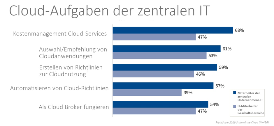 Mit der wachsenden Verbreitung der Cloud wird auch die Cybersicherheit (49%) zum Thema – insbesondere dann, wenn die Cloud-Strategie sowohl die zentrale Unternehmens-IT als auch IT-Teams in dezentralen Geschäftsbereichen betrifft. Auf die Frage, wer für die Kosten von Cloud Services verantwortlich ist, verwiesen 68% der zentralen IT-Mitarbeiter auf sich selbst. In den einzelnen Geschäftsbereichen ergab sich ein anderes Bild: Hier sahen nur 47% der Befragten die Verantwortlichkeit auch bei der zentralen IT. Die unklare Aufgabenverteilung sorgt nicht nur für Verwirrung, sondern kann sich auch langfristig negativ auf Kosten, Sicherheit und Compliance auswirken.