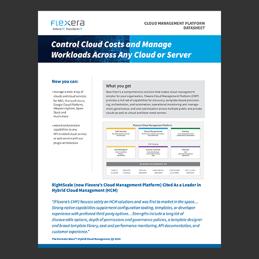 Flexera’s cloud governance solutions provide a powerful and flexible policy engine combined with a unique ability to see your entire hybrid IT estate. This enables you to govern not just your public cloud but your on-premises, cloud licenses and SaaS environments as well.