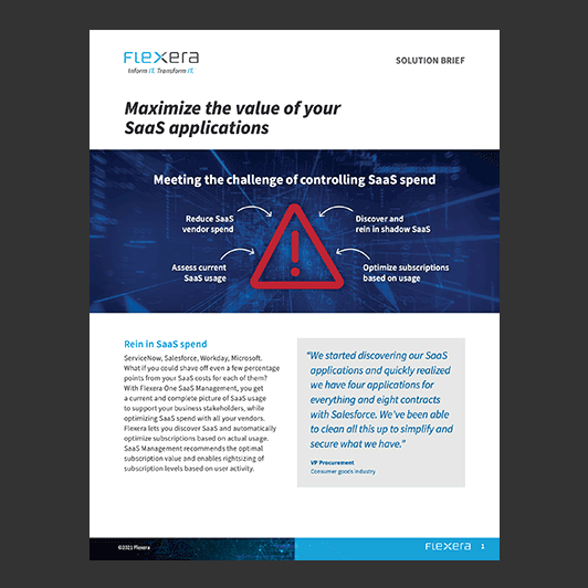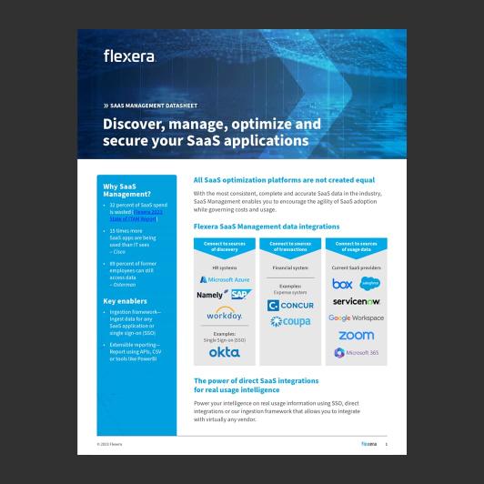 Flexera drives SaaS cost optimization with trusted usage data that enables you to accurately map SaaS spend to business units, rightsize licenses and prepare for contract renewals. With Flexera, you’ll align IT, finance, and procurement with shared visibility and accountability—driving cost efficiency, improving forecasting and ensuring SaaS investments support strategic business outcomes.