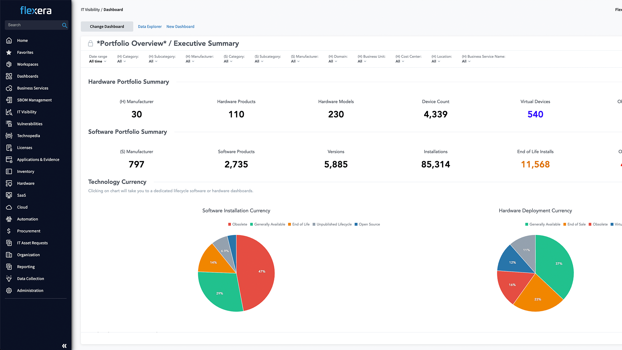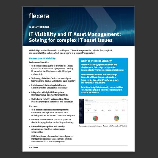 The increasing complexity of hybrid environments makes technology challenging for IT teams and organizations. That’s why Flexera One IT Visibility is built on the Technology Intelligence Platform, ensuring you can deliver key technology insights to stakeholders across the business with the latest enhancements. Provide comprehensive visibility for the IT estate across your organization, including advanced analytics, API extensibility, faster processing and normalization, and an accelerated data pipeline to the IT ecosystem—including CMDBs like ServiceNow.