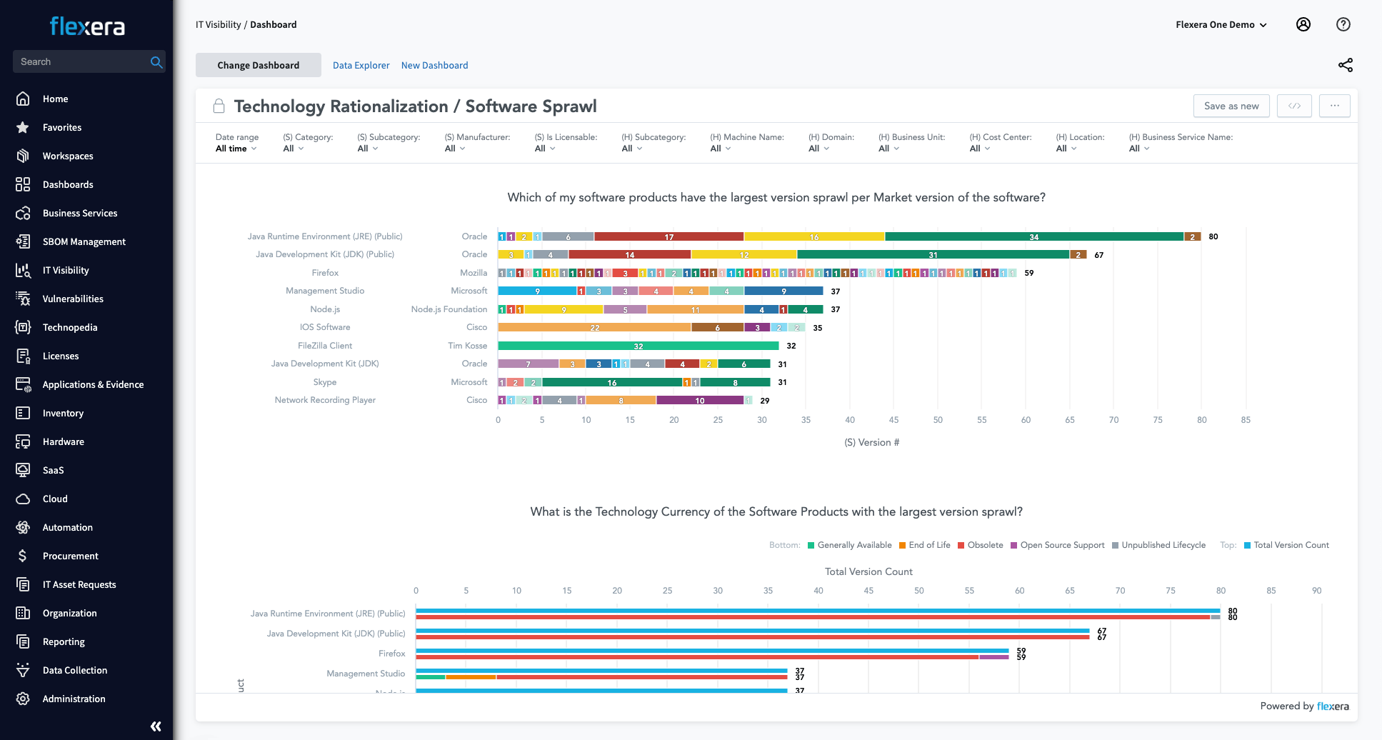 Flexera uses a combination of comprehensive inventory, automated software normalization and functional categorization (powered by Technopedia and AI) to group similar applications, making it easy to spot overlaps and redundancies.