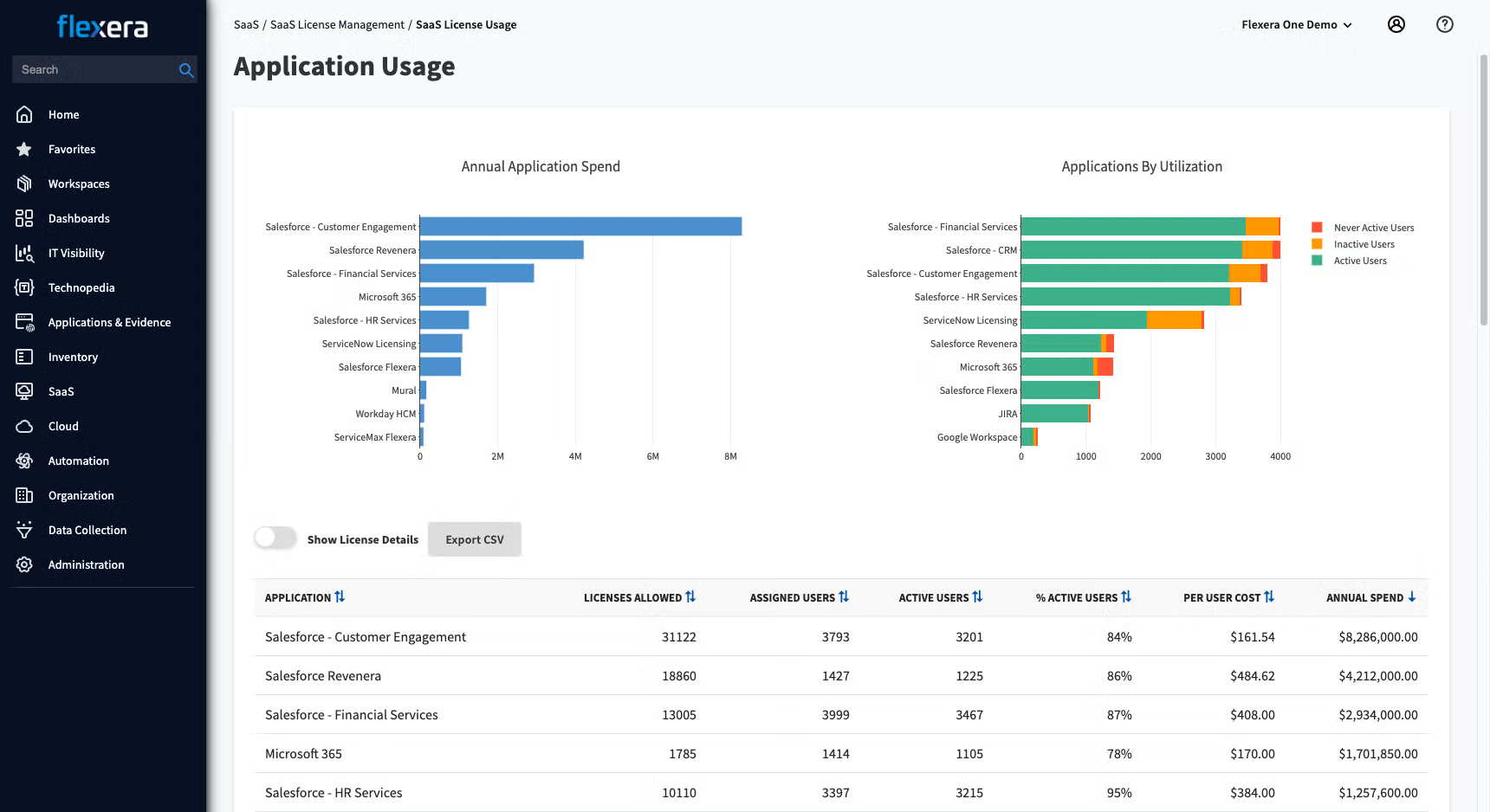 Flexera One combines SAM and SaaS Management to uncover overlapping tools, idle licenses and shadow IT. With usage insights and rightsizing recommendations, you can cut waste, negotiate smarter renewals and align with FinOps guardrails.