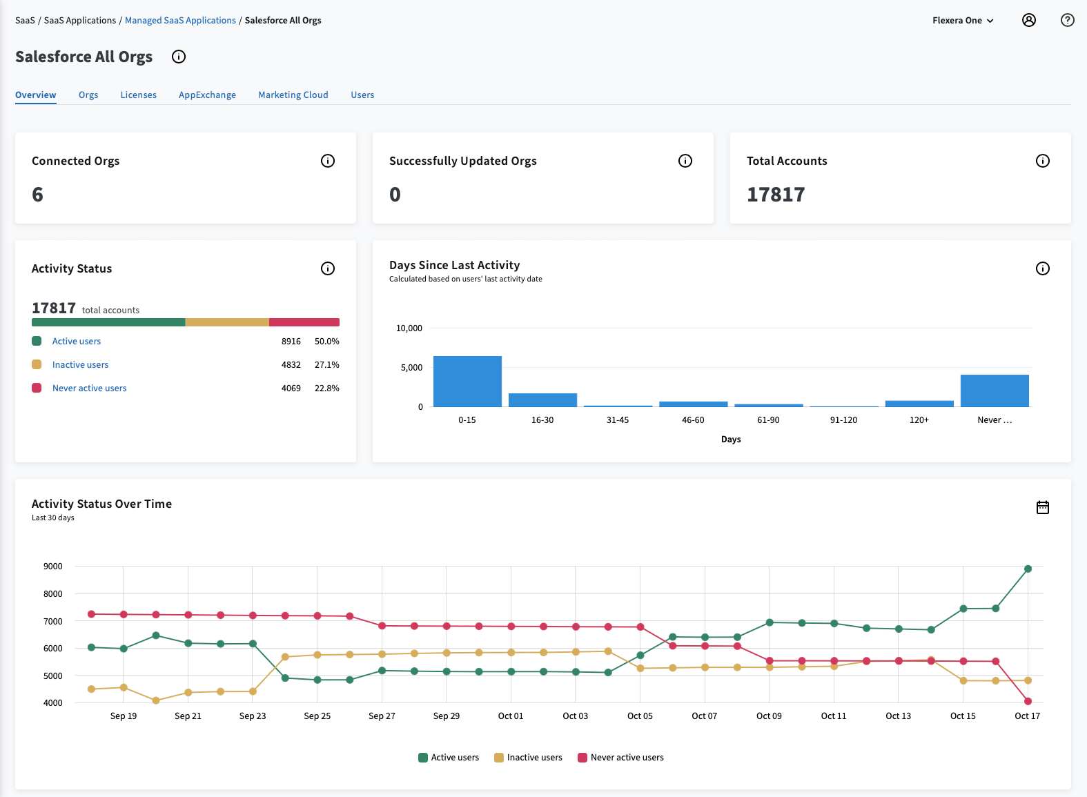 Salesforce spend is high, making optimization opportunities significant. Flexera One Select for Salesforce solves the challenges with managing one of your biggest cost centers. With Flexera One Select for Salesforce, your organization can not only track users, but also overall spend (even across multiple orgs), license consumption and activity.