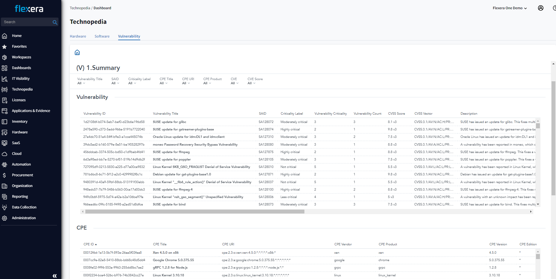 To prioritize remediation of software vulnerabilities, it’s important to consider multiple attributes, including EOL/EOS, application location, department and whether the application contains sensitive information. Flexera One utilizes Secunia Research (alongside public National Vulnerability Database (NVD) data) to provide more granular matching of build-level versions of software in your normalized inventory within its IT Visibility solution.
