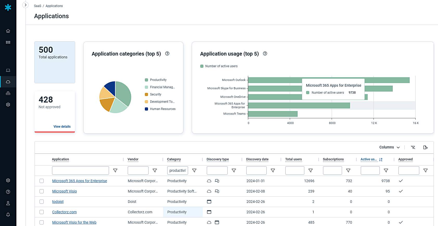 - First, using various discovery methods (agent, API connectors, browser extension, SSO, etc.), we obtain a comprehensive inventory of on-premises, SaaS and cloud applications