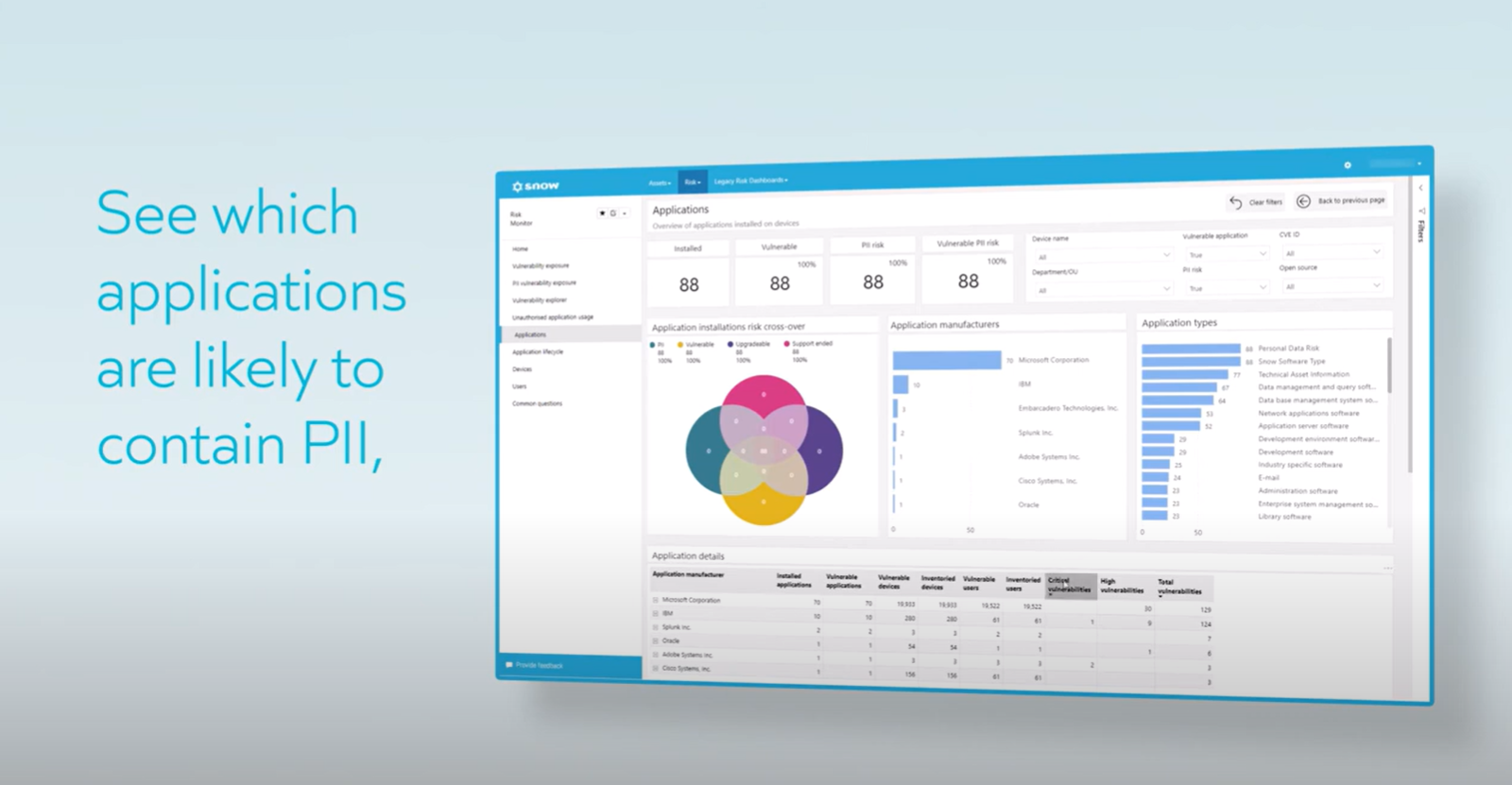 Snow Risk Monitor provides complete visibility of all devices, users and applications. Automated discovery provides a detailed account of which users have access to which applications and how they are used. Snow Risk Monitor shows which vulnerable applications are in use and where they reside and identifies attack vectors of the path of a vulnerability. Applications are also classified to highlight where personal data could be stored and processed.
