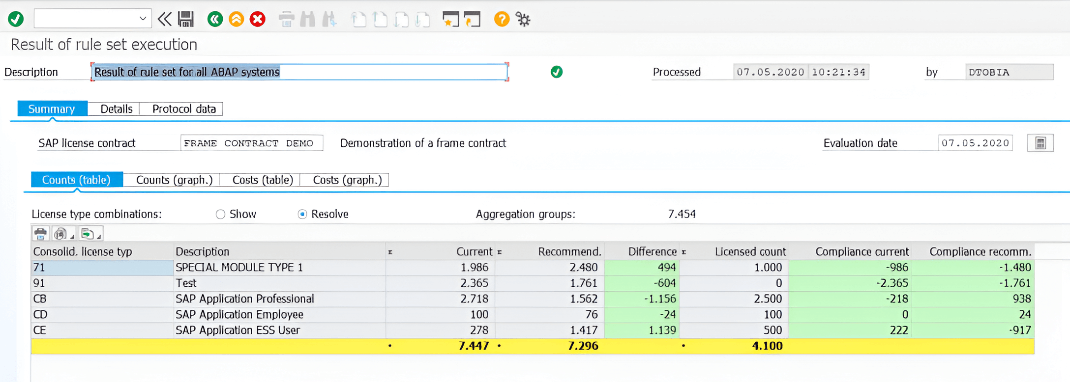 Snow Optimizer for SAP Software has a built-in contract management capability where you can enter and maintain all the SAP products of your license contracts. This is regardless of whether it is a named user license, an engine or a database. Most SAP engines are measured by SAP’s system measurement (USMM) transaction. Our product collects and aggregates all system measurement data for the connected satellite systems. Additional formulas can be used to combine measured data. For engines that cannot be measured by USMM (engines with metrics such as revenue or number of company employees) you can self-declare their usage in the Snow Optimizer for SAP’s contract management section or use the product-specific inventory detection (classes). Our product also provides customers with an engine compliance analysis report to monitor your license position.