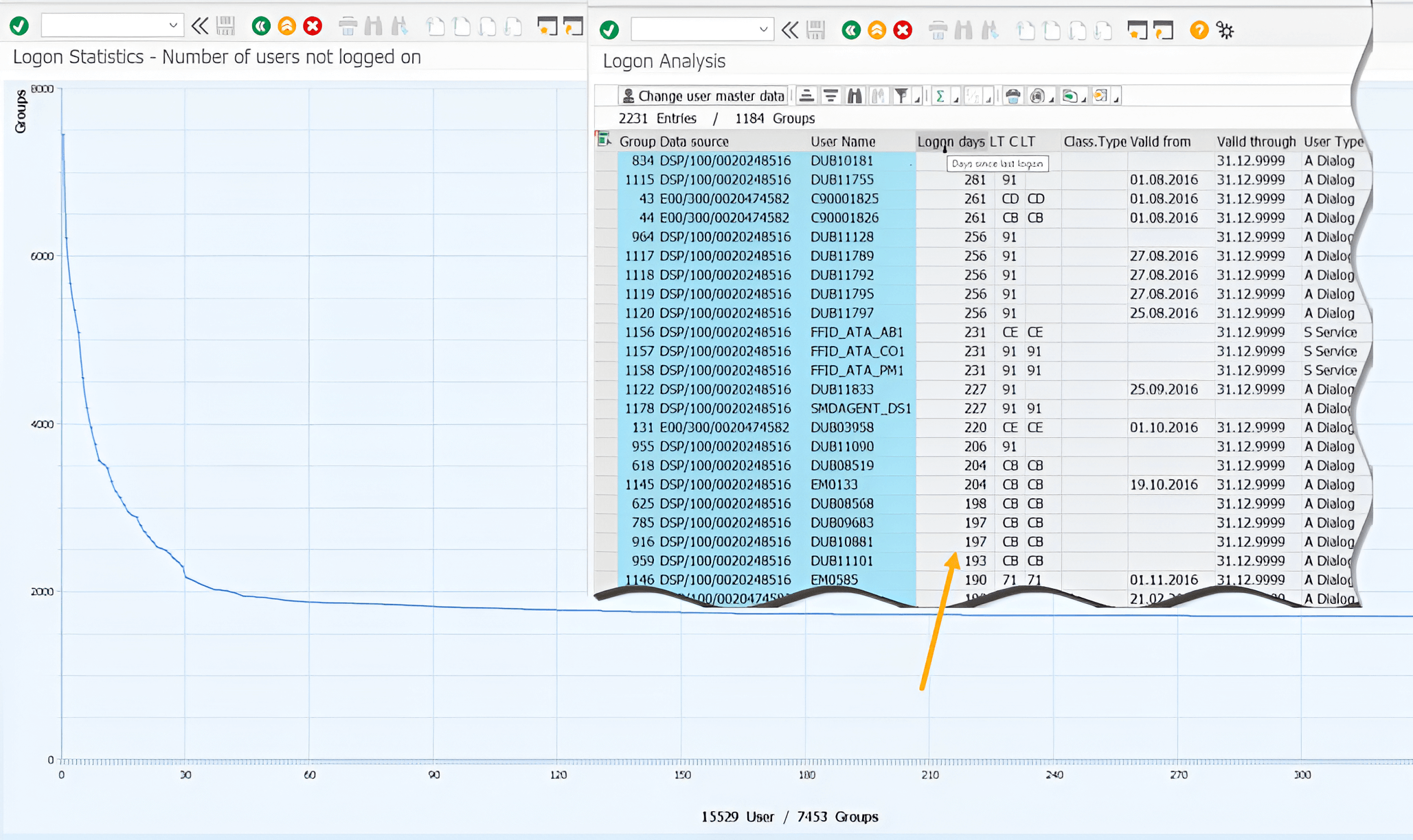- Activity checks – work time, work volume, cross-component usage, to identify potential indirect access (technical) users