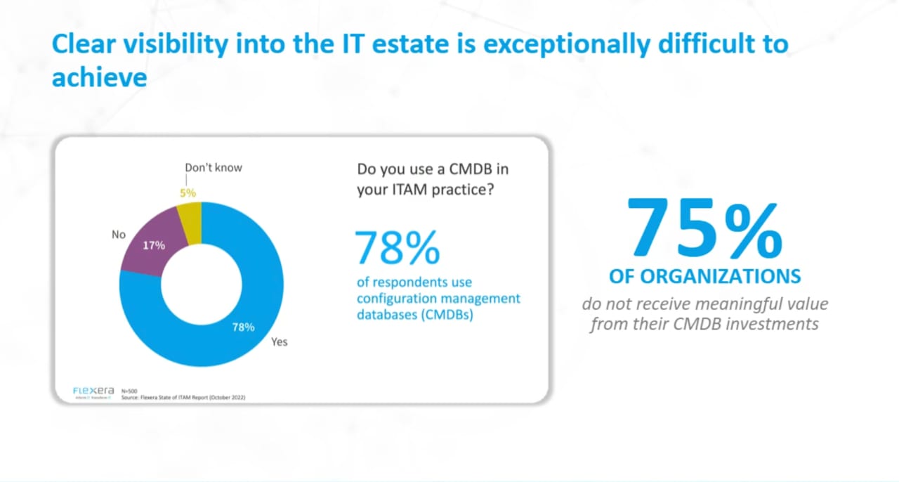 If you find it challenging to keep track of all the software and hardware in your IT estate, you’re not alone. Managing software assets can be a complex task that often leads to inefficiencies, compliance risks, and software vulnerabilities. Many struggle to manage their asset environment. In fact, according to the Flexera’s 2022 Tech Spend Pulse, over 50 percent of companies struggle to make strategic business decisions due to not enough good quality data.