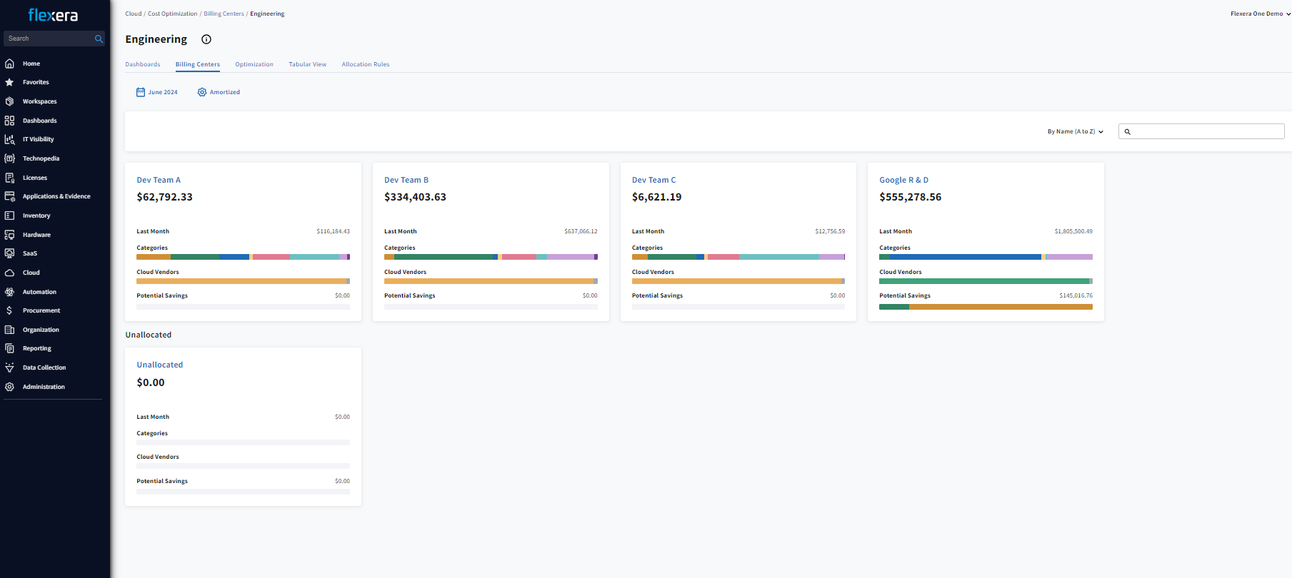 Flexera ingests billing data from your cloud providers and uses your tagging strategy to automatically allocate costs to the appropriate dimensions (e.g., teams, projects, cost centers), providing accurate showback and chargeback.