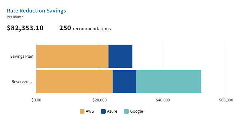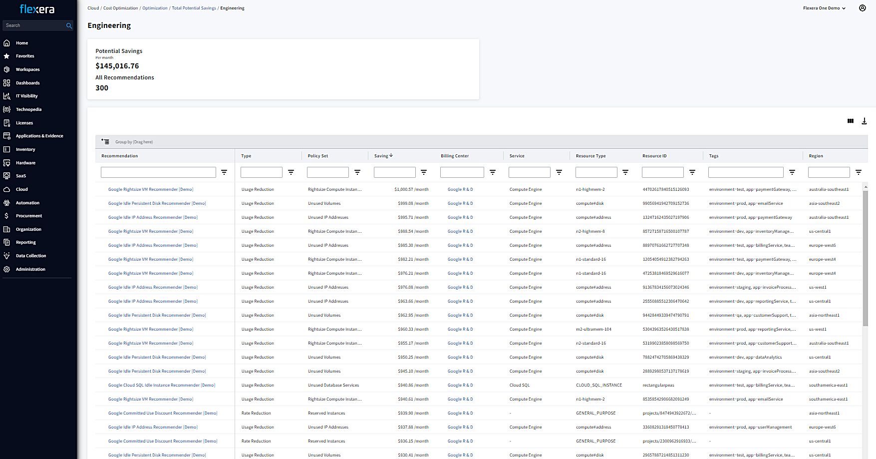 Flexera provides a wide range of recommendations, including identifying idle resources for termination, rightsizing over-provisioned instances and purchasing or modifying Reserved Instances and Savings Plans to maximize discount coverage.