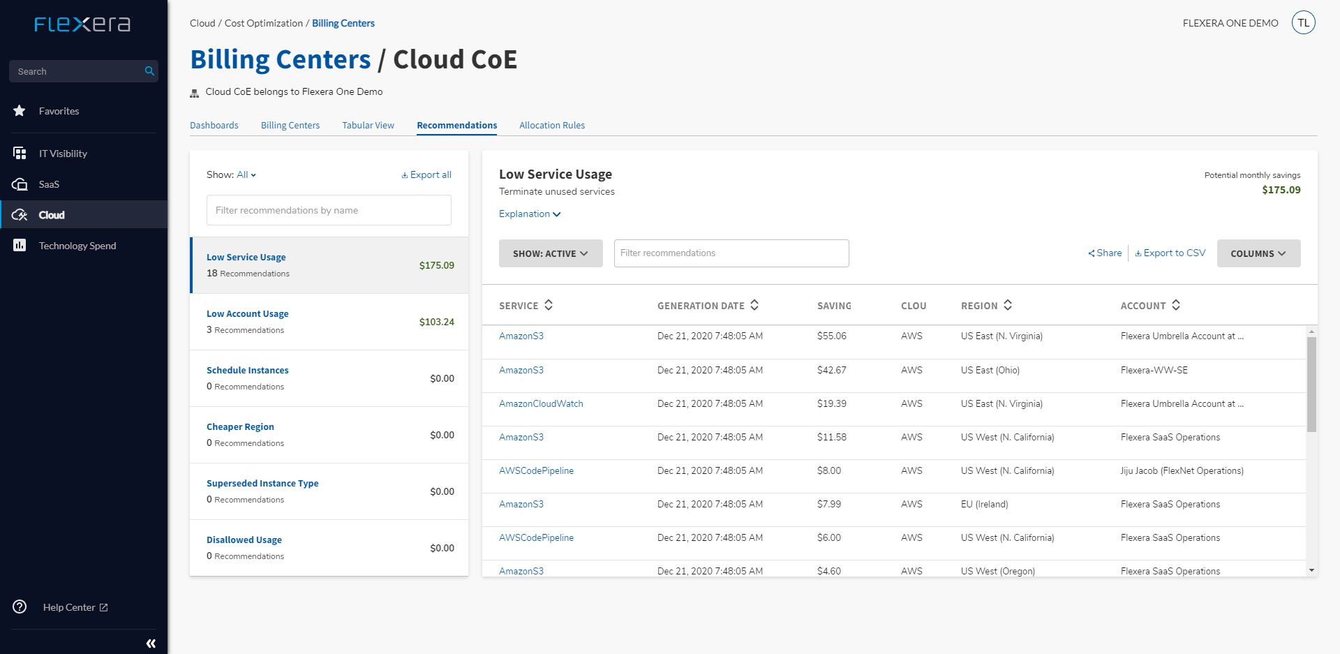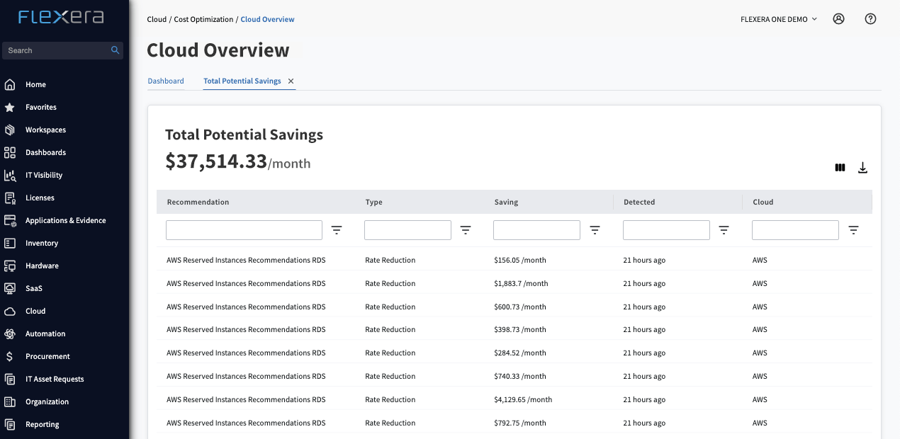 Flexera analyzes your detailed billing and usage data and applies a library of over 90 policies to identify specific savings opportunities such as idle instances that can be deleted or commitment discounts that can be purchased.