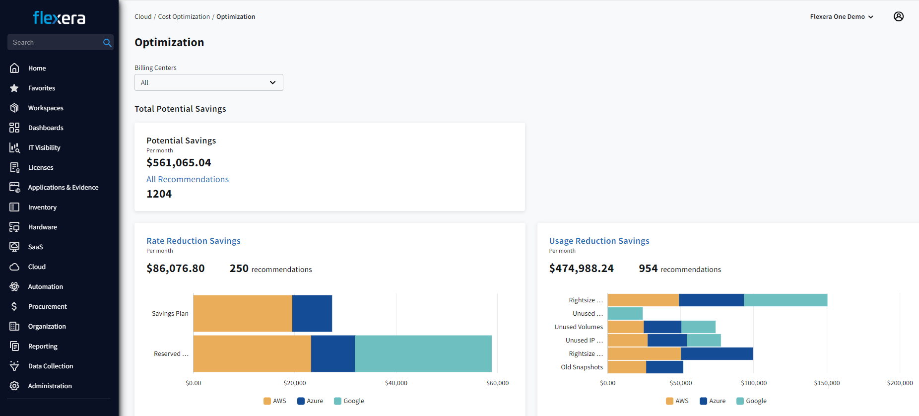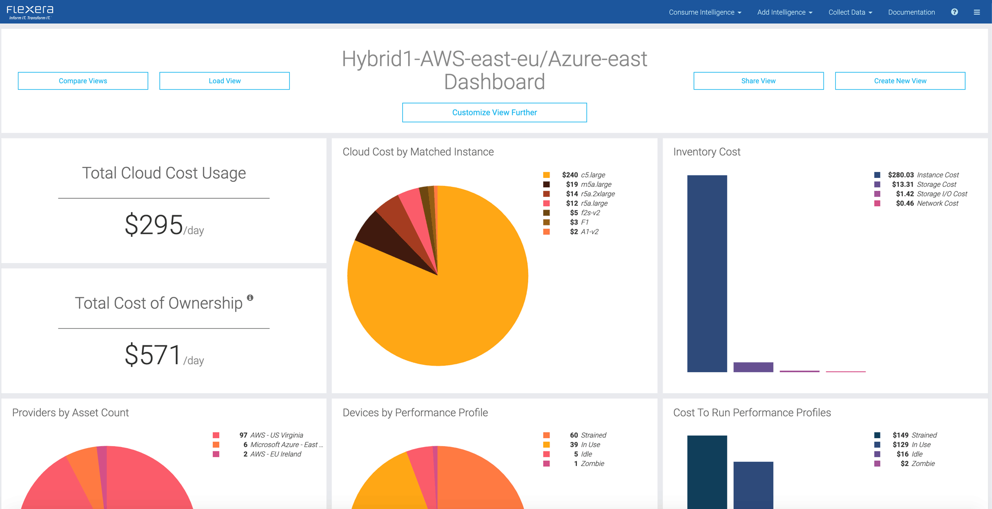 Whether public, private or hybrid cloud, Flexera provides a comprehensive cloud cost analysis to show you which cloud type, provider, instance choice, buying type and resource provisioning are best for your workload, budget and performance requirements—all to optimize your cloud costs and increase spend efficiency.