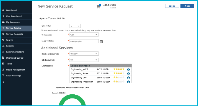 Flexera provides a comprehensive self-service experience, complete with a user portal, customizable service catalog and full lifecycle automation capabilities. Ensure consistent and predictable delivery of IT services across your hybrid cloud infrastructure through standardized, automated processes, with quick service delivery that won’t slow down even the most agile development teams.