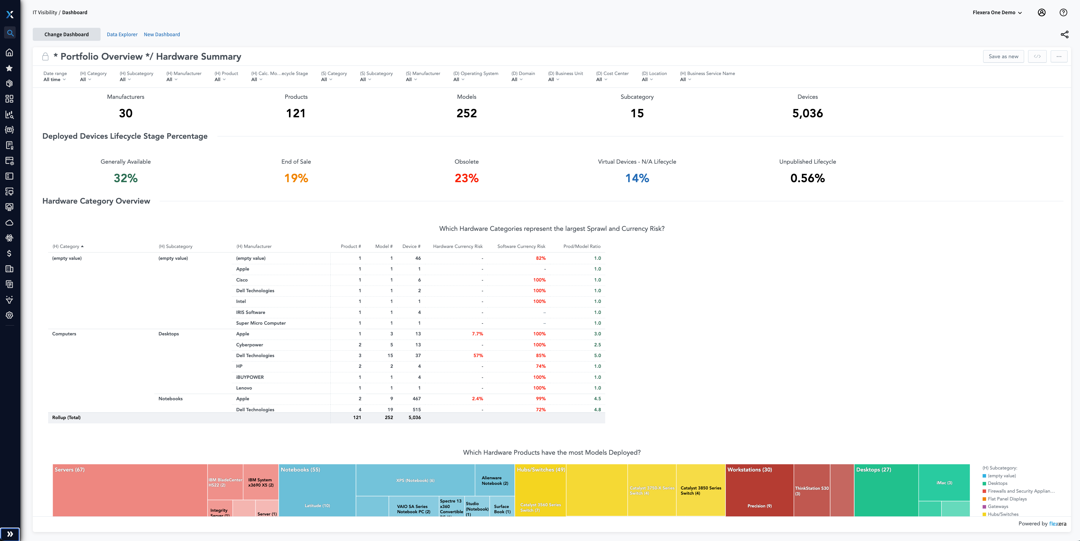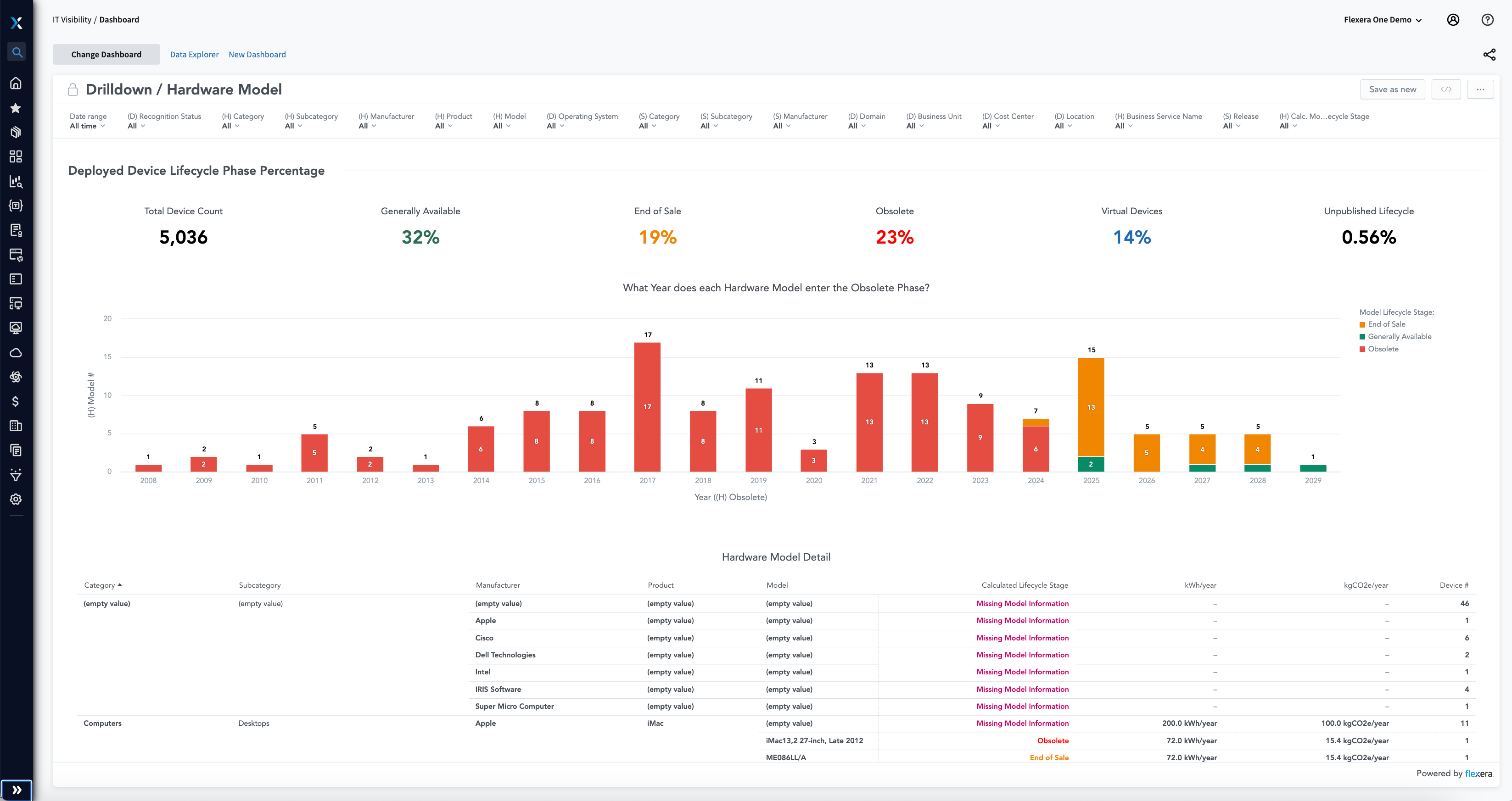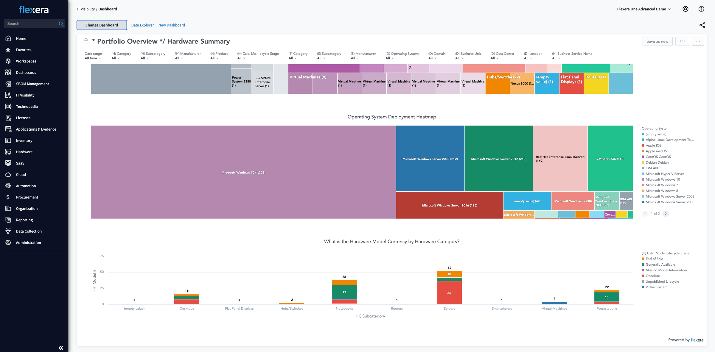 Flexera discovers, inventories and tracks hardware as it matures through its useful lifecycle and moves within your environment. Even if you already have an inventory tool, Flexera One integrates with it to normalize and enhance data so you can visualize your estate with additional insights such as users, business unit, role and warranty expiration dates.
