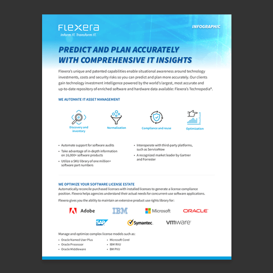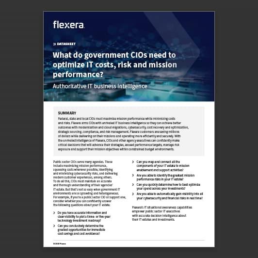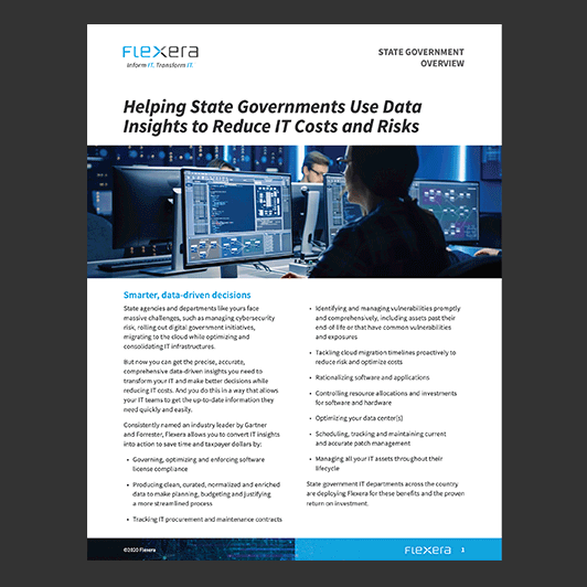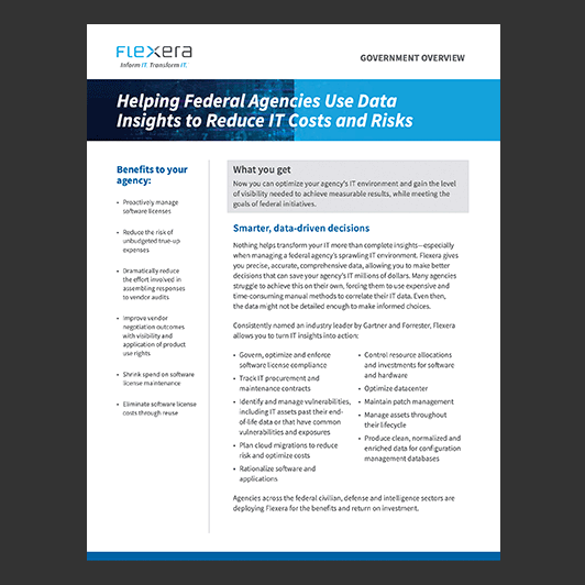 Flexera’s IT Asset Management, IT Visibility, and FinOps solutions bring a multilevel, comprehensive approach to software optimization, which can benefit any organization in the public sector.
